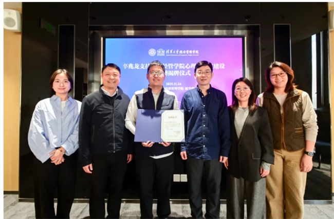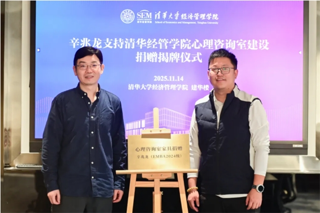 2025年11月14日,清华经管EMBA2024级校友、广东顶固集创家居董事长辛兆龙支持“清华经管学院心理咨询室建设”捐赠揭牌仪式在清华大学建华楼举行。清华经管学院党委副书记刘庆,清华经管学院基础设施建设办公室主任、行政办公室主任黄为华出席活动。
